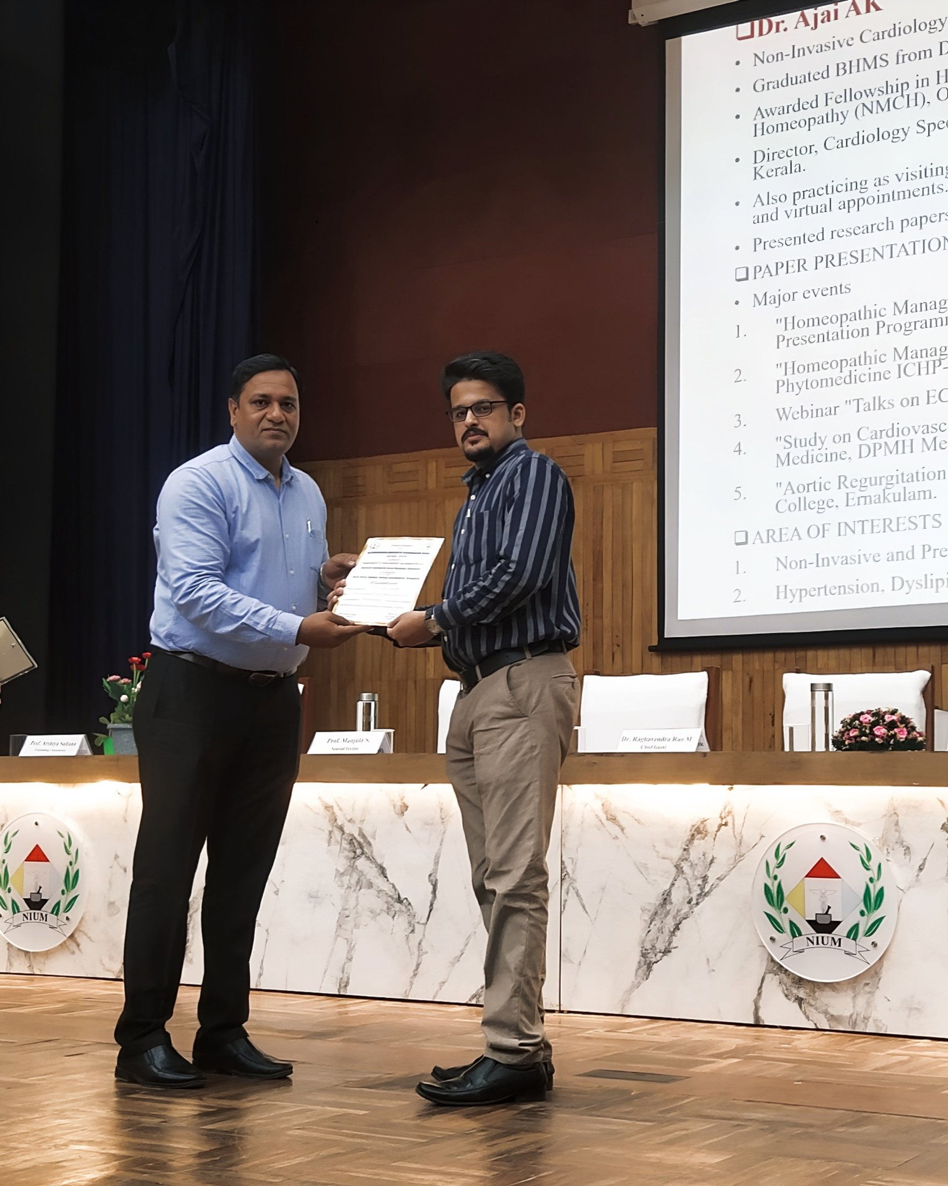 Not recognized by NCH India. Recognized under regulatory frameworks of CHO, Ontario, Canada.Invited Guest Speaker faculty representing Homeopathy, rendered scope of Homeopathy Medicine in Cardiology at "National Conference on Interdisciplinary Approach to Cardiovascular Health" on 6th July 2024, a National Cardiology Conference, hosted by National Institute of Unani Medicine (NIUM) Bangalore, an autonomous organization under Ministry of AYUSH, Government of India.