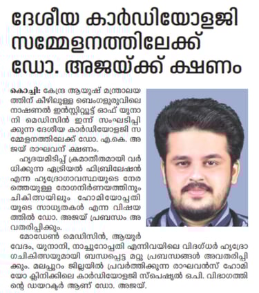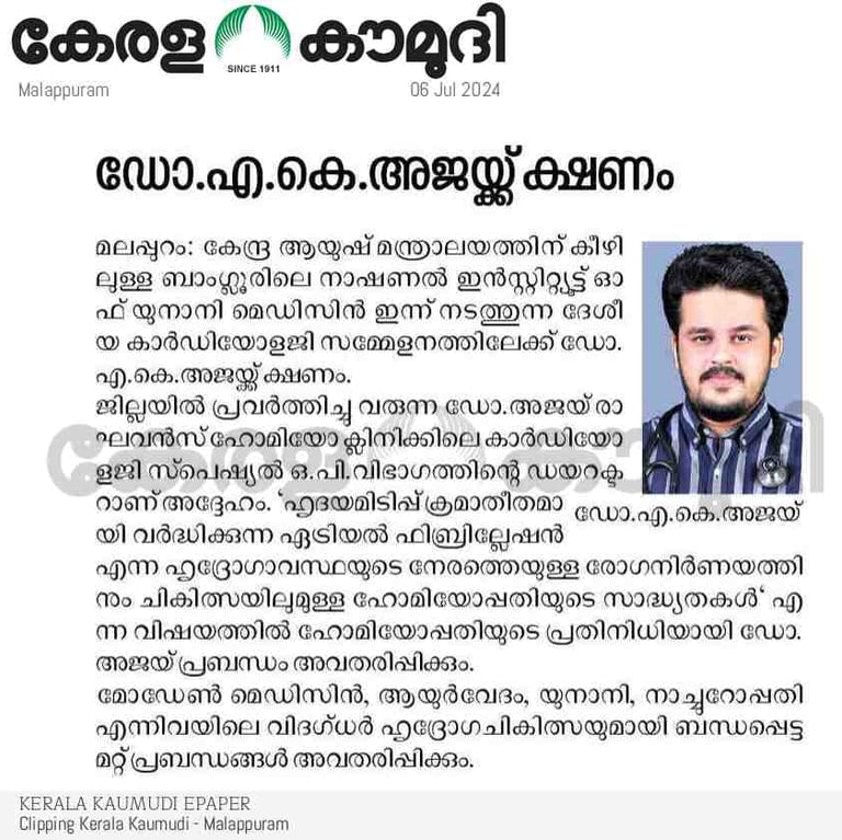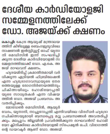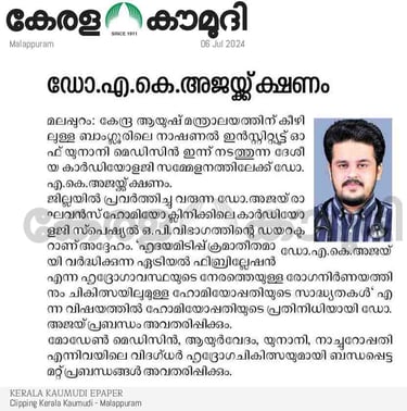 First Homeopathy doctor from Kerala, India to recieve instituitional academic Fellowship in Homeopathic Cardiology, (FH-Cardiology) from North American Medical College of Homeopathy (NMCH), Ontario, Canada. Not recognized by NCH India. Recognized under regulatory frameworks of CHO, Ontario, Canada.